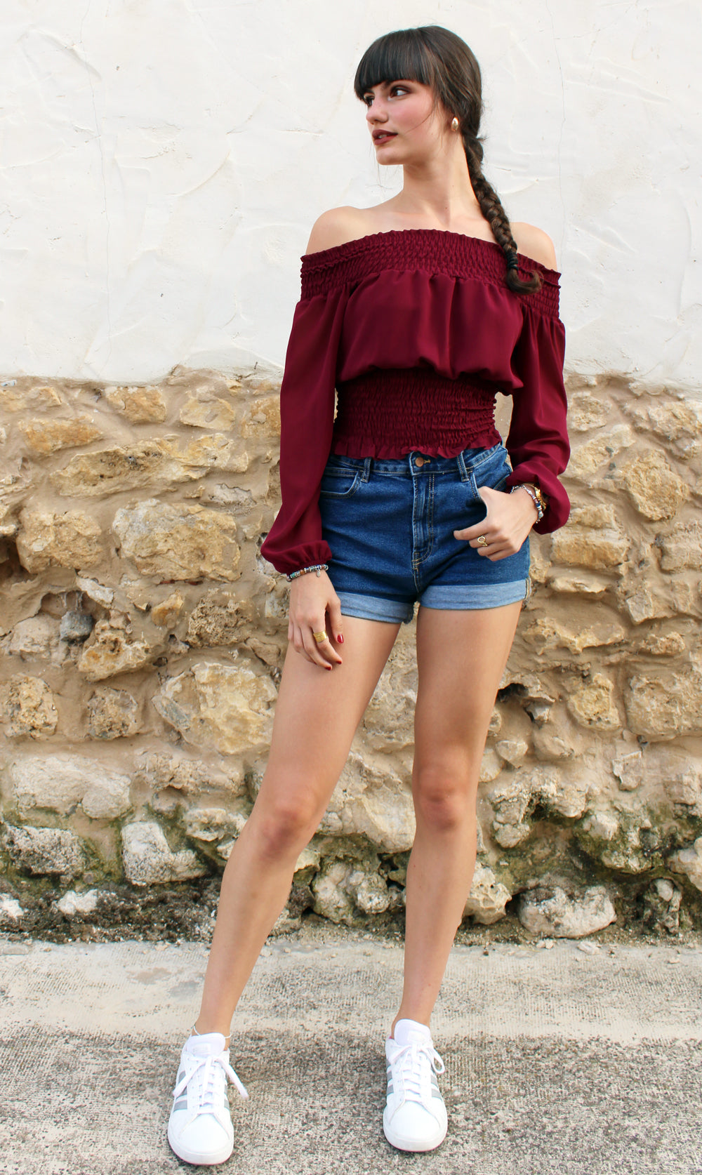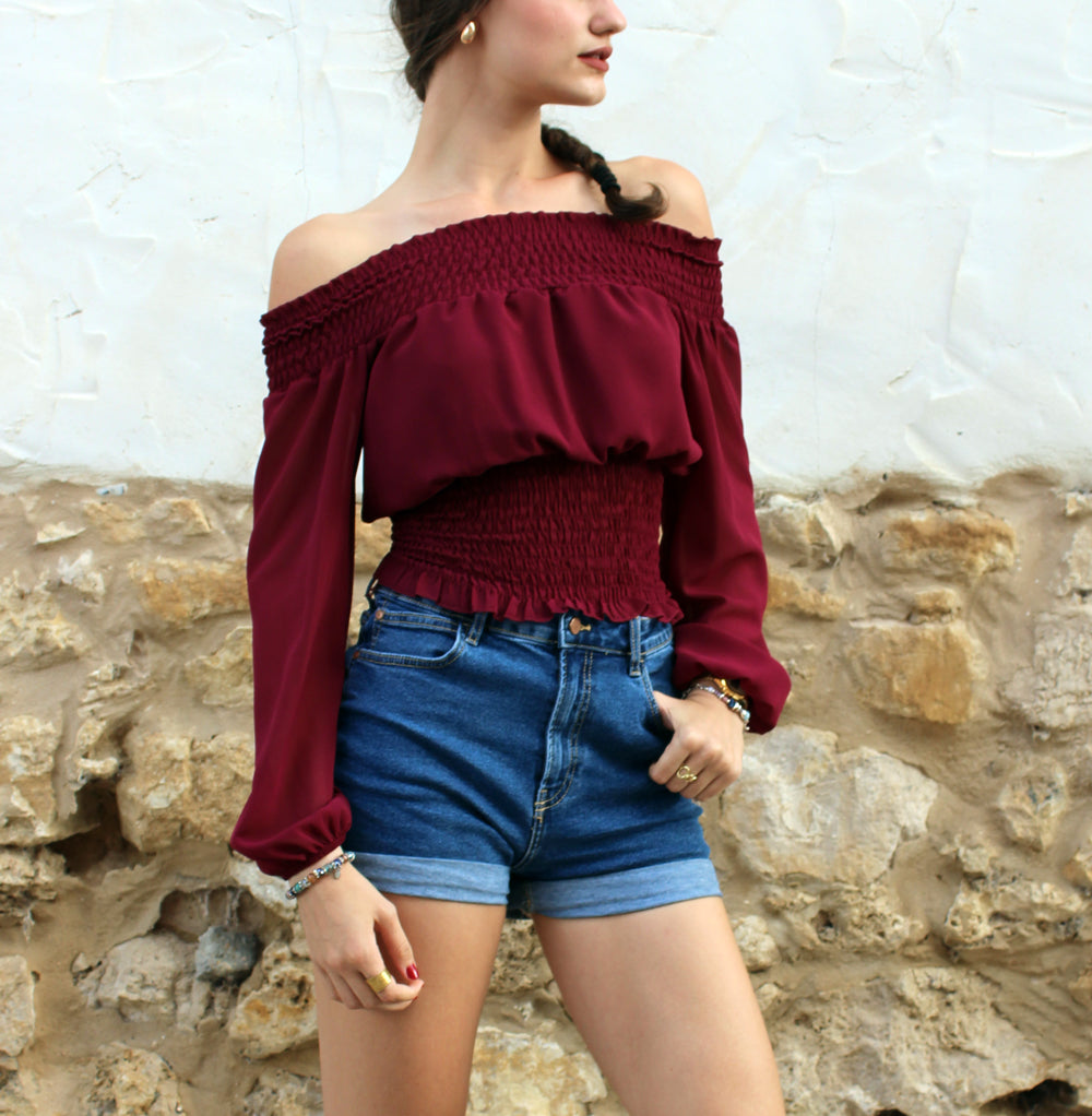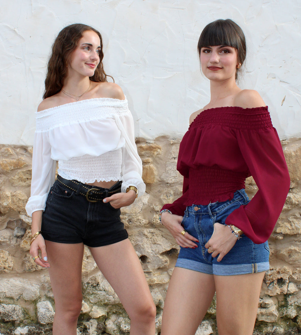 Chiffon top with bardot neckline and elastic honeycomb waist.