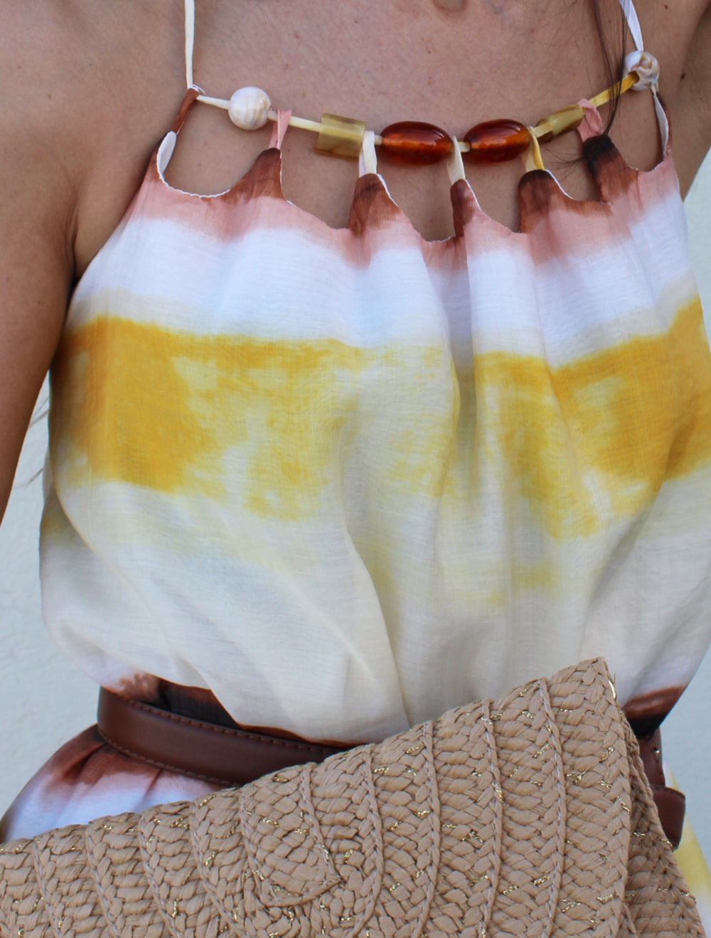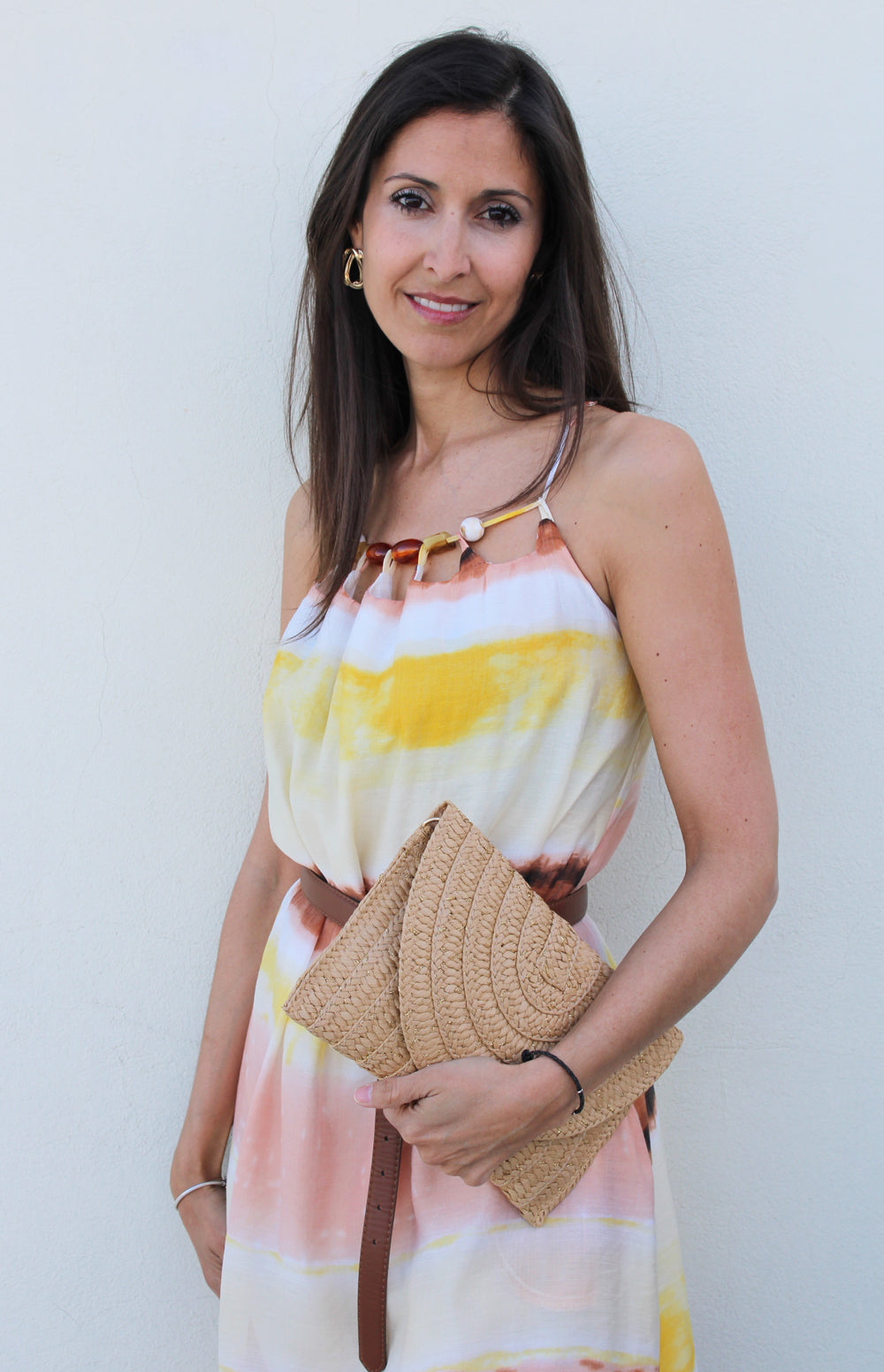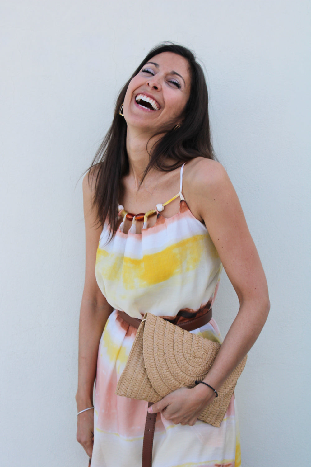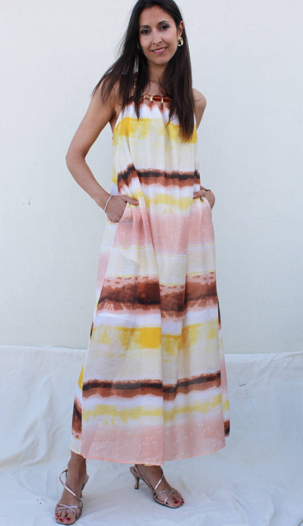ALEJANDRÍA dress with a gradient print in yellow, white and brick tones, with a jewel neckline and crossed straps on the back . Combine it with gold accessories to go from a daytime look to an evening or night look! Ideal with a handbag like our MOON raffia bag . This dress has a secret: its pockets!! And if you want, you can wear it with a belt to frame your silhouette.
