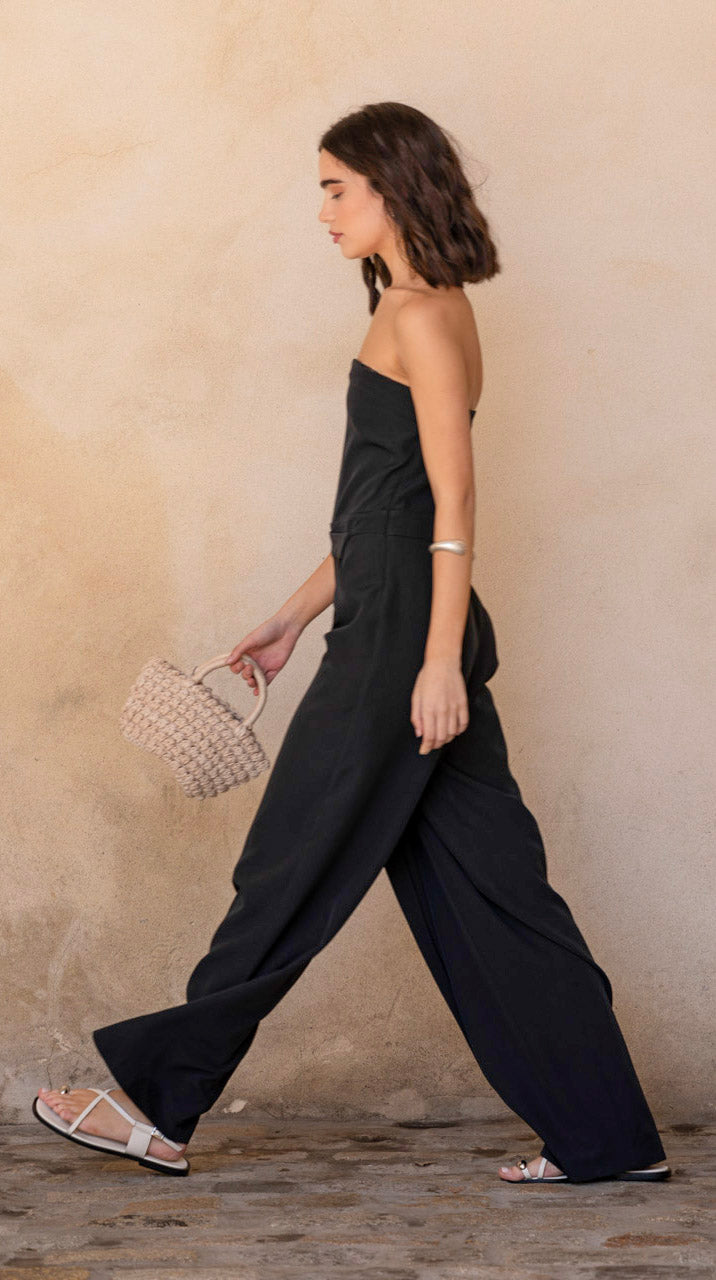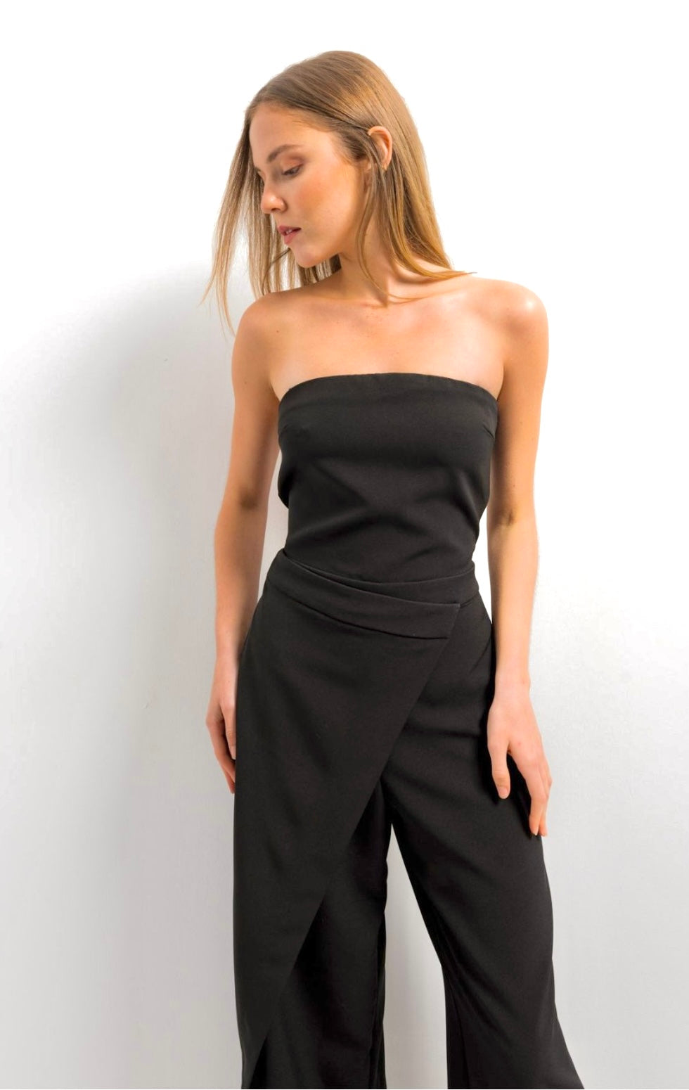 Mono largo, estilo traje, en color negro con detalle de cierre pareo y escote palabra de honor. Cierre con cremallera lateral. Diseño y Patronaje Hecho en España. 86% poliester 14% elastano