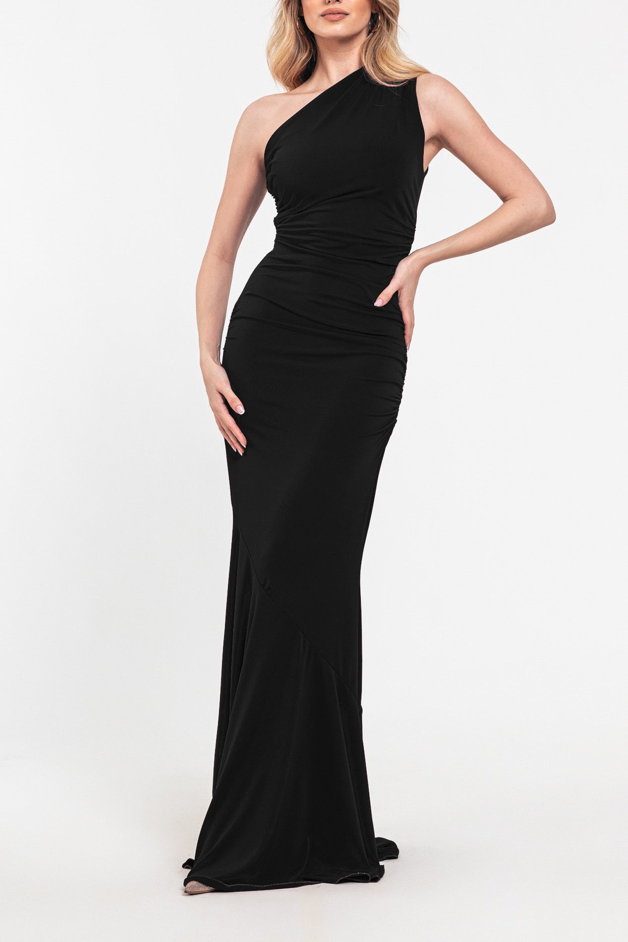 Vestido largo negro ajustado y asimétrico. Diseño fruncido y moldeado para resaltar tu silueta. El vestido de invitada o graduación que hará sentir especial e inolvidable. ¡Prepárate para robar miradas y recibir cumplidos!